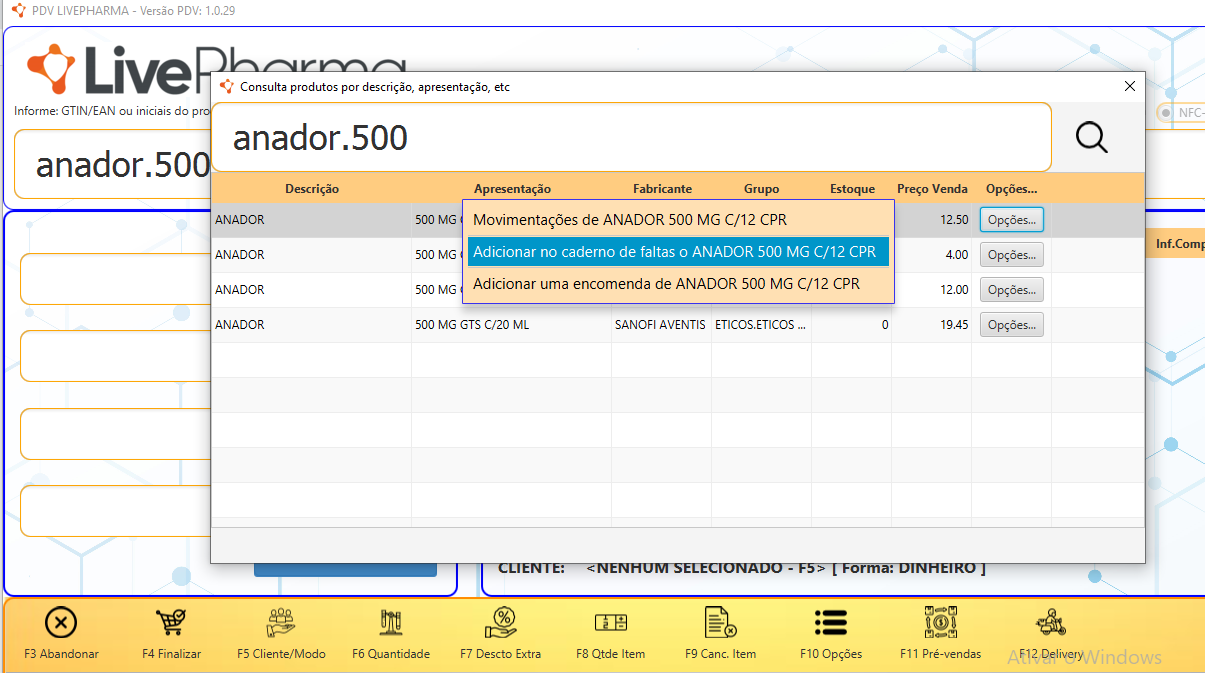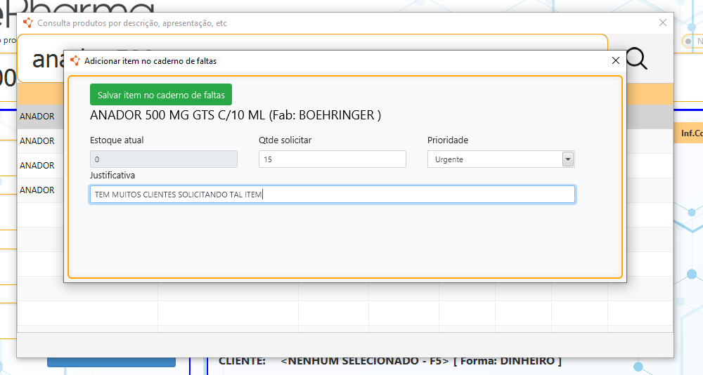 No exemplo acima, o colaborador adicionou 15 unidades, do produto ANADOR ao caderno de faltas.
