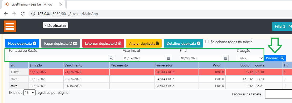 Para efetuar o pagamento de uma ou mais duplicatas, primeiramente localize-a utilizando os filtros primários que estão na tela inicial.