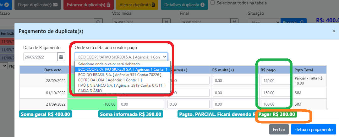 A marcação em VERDE, permite informar o valor do pagamento. No exemplo acima percebe-se que são duas duplicatas no valor de R$ 150.00 e uma de R$ 100.00. A primeira receberá um pagamento parcial no valor de R$ 140.00 e as demais serão quitadas com pagamento total.