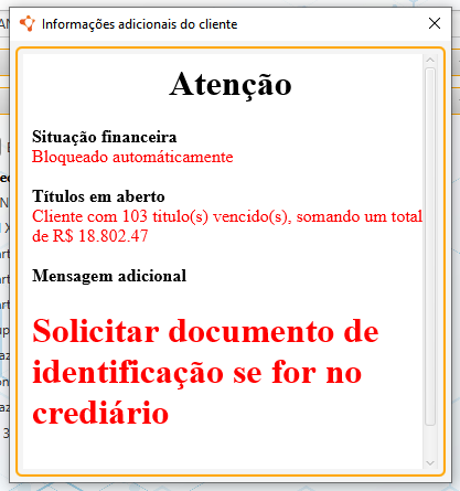 <h1 style=“color:red;”>Solicitar documento de identificação se for no crediário</h1>