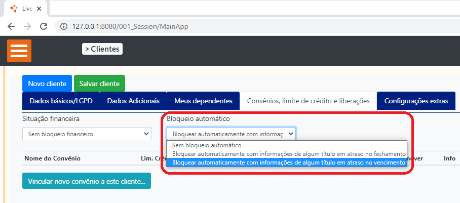 Será descrito agora o funcionamento do bloqueio automático para clientes, sempre levando em consideração que o bloqueio de clientes será executado a parte do bloqueio de convênios, onde um executa independente da configuração do outro.