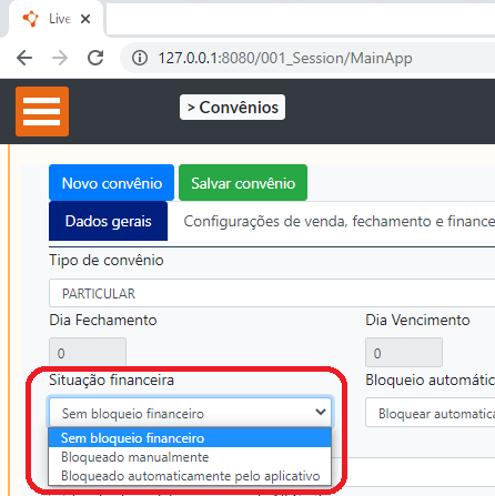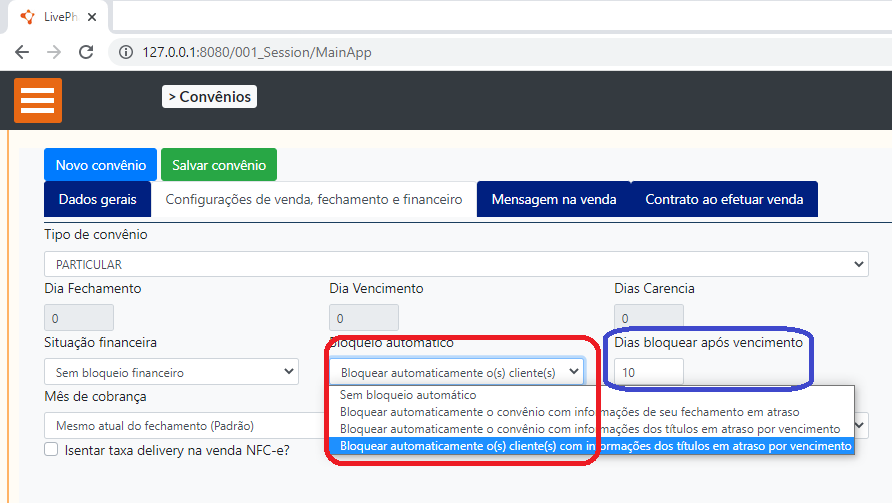 Sem bloqueio automático → Jamais bloqueará um convênio, mesmo tendo títulos em atraso por vencimento ou fechamento