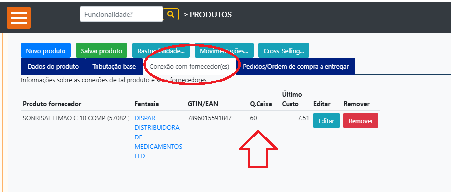 Exemplo: produto “SONRISAL PO SABOR LIMÃO”. O fornecedor comercializa 1 caixa com 60 unidades. Nesse caso, deve-se conectar o GTIN/EAN de tal item, informando que a fração será 60. Dessa forma, ao comprar 1 caixa de SONRISAL PO SABOR LIMÃO, no seu estoque será convertido para 60 unidades. Esse é o modo que a farmácia vende tal produto. A conexão também é utilizada para fazer Compras, Atualizar preços, etc.