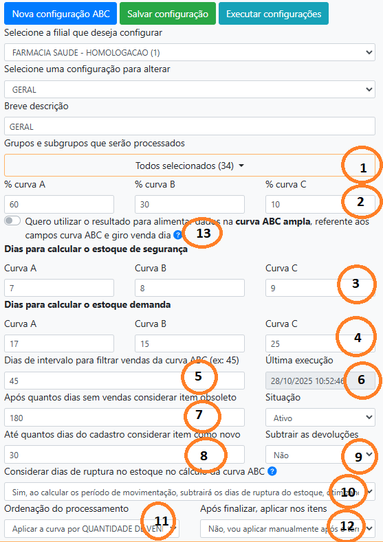 O LivePharma executará a curva ABC conforme o intervalo de dias configurado pelo gestor. Ocorre que ele ainda permite aplicar o resultado nos produtos, alterando suas demandas diárias, indicando ser é um item novo ou não, indicando se tal item é obsoleto ou não, etc.
