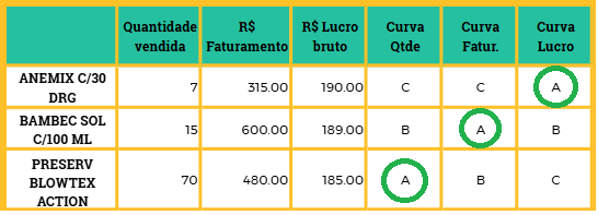 Conforme exemplo acima, o PRESERVATIVO pode pertencer a curva A pela QUANTIDADE, mas ser da curva B ou curva C quando analisado pelo valor de faturamento ou valor de lucro. Assim como um produto chamado ANEMIX pode ser B ou C pela quantidade ou faturamento, mas ser curva A pelo lucro.