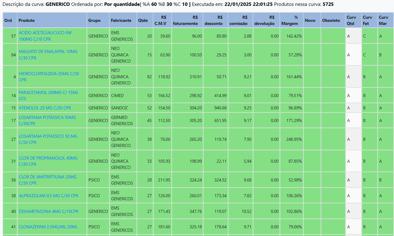 A curva ABC do LivePharma permite gerar sua ordenação por 3 formas, seja por quantidades, seja por valor de faturamento e ou por lucro. A opção padrão é por quantidade, mas isso fica a critério do gestor da empresa.