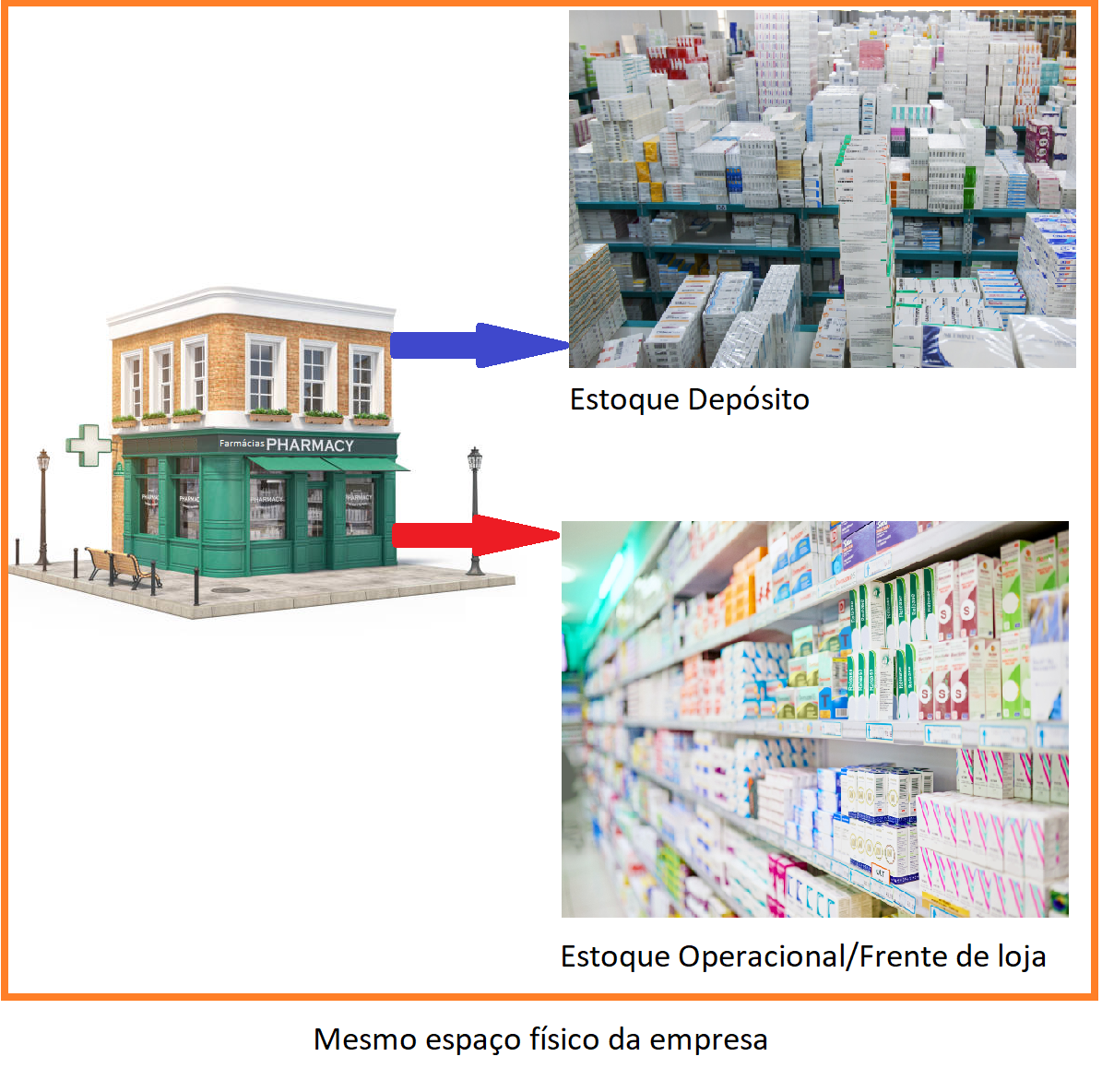 Processo utilizado quando a empresa possui na mesma loja, uma divisão clara de seu estoque. Uma parte fica disponível para comercialização na frente da loja, chamado de estoque operacional/frente de loja e outra parte das mercadorias fica disponível, na mesma loja física, mas em um local específico, pronto para ser encaminhado para outras filiais da empresa ou até mesmo para a própria loja. Permite-se esse controle somente para filiais que possuem a mesma base do CNPJ.