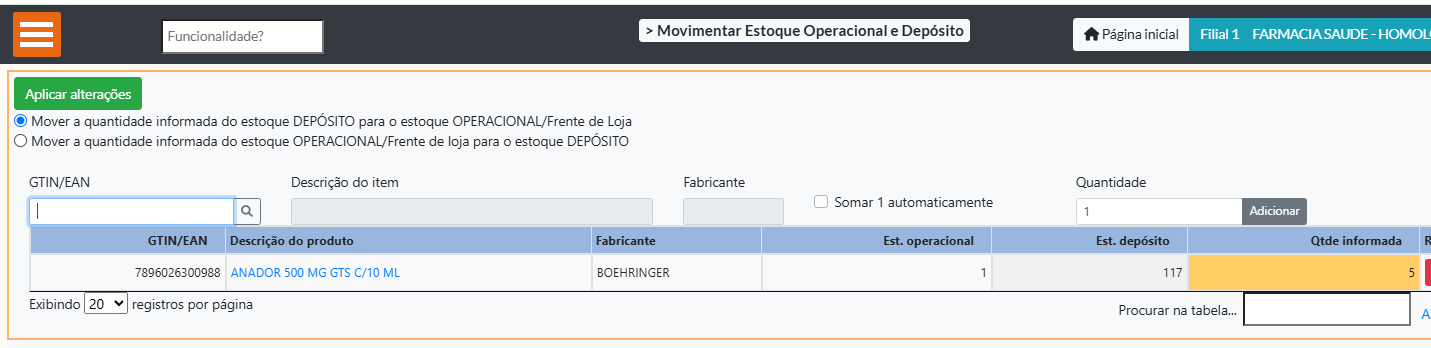 Feito isso, basta clicar em “Aplicar alterações”. Com isso, o estoque DEPÓSITO do ANADOR ficará valendo 112 (117 - 5) e o estoque operacional ficará valendo 6 (1 anterior + 5 movido do depósito).