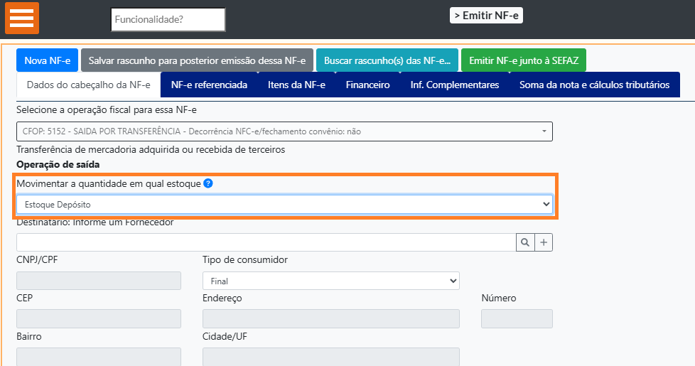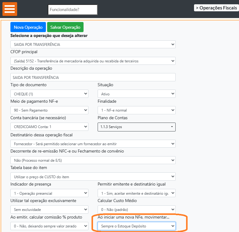 Primeiramente deve-se configurar a operação fiscal de transferência para movimentar o estoque Depósito.