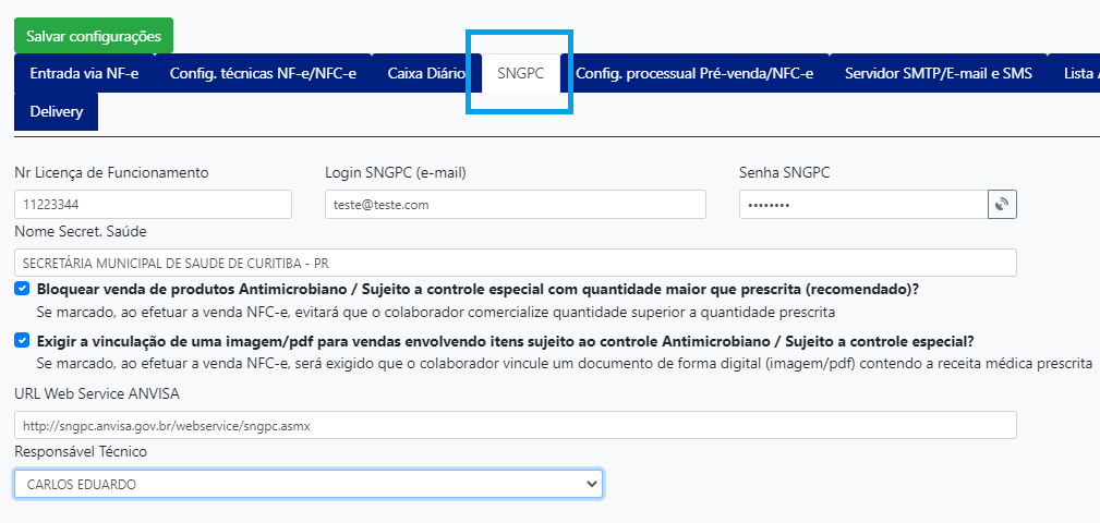 A última etapa está relacionado a configuração do usuário e senha da farmácia para acessar o sistema federal SNGPC, bem como a definição do farmacêutico responsável e demais configurações.