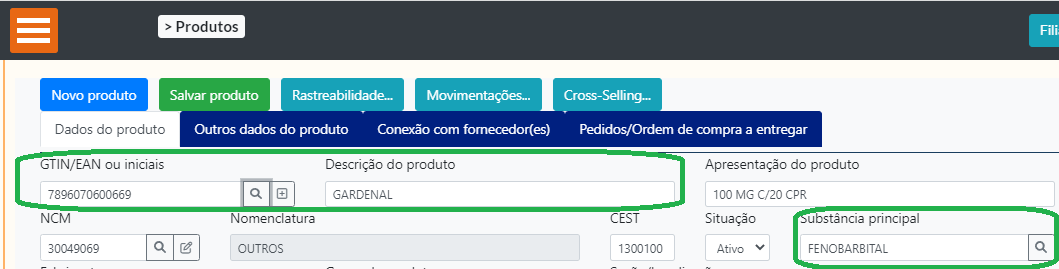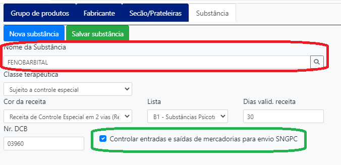 Agora, reduzindo a controles administrativos do livepharma, sua base de sustentação está na conexão do produto com a substância principal a ser controlada. Essa deve estar configurada para controle especial de entrada e saída SNGPC.