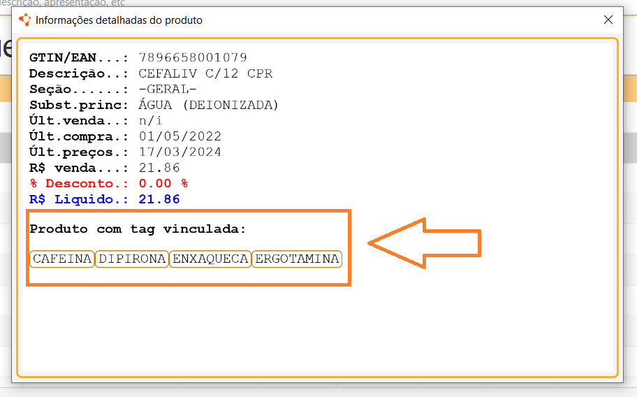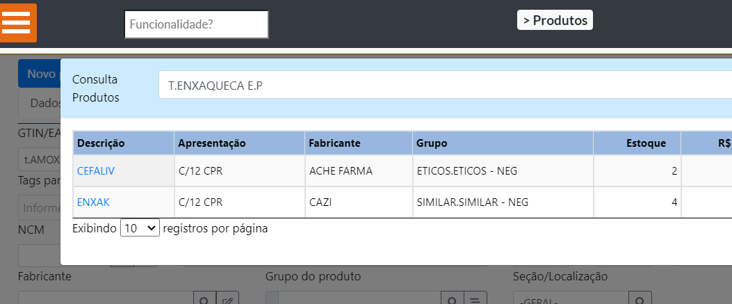 Agora outro exemplo, buscando produtos com a tag “ENXAQUECA” e que possuam estoque positivo.