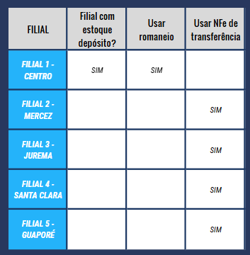 Conforme o exemplo acima, a FILIAL 1 - Centro possui o estoque depósito, distribuindo para as demais lojas. Mas ela também comercializa os produtos nela mesma. Dessa forma, quando o serviço que calcula as quantidades a transferir for executado e detectar tal situação, para a FILIAL 1 - Centre será gerado um romaneio, enquanto que para as filiais 2,3,4,5 será gerado um rascunho de NFe. Esse rascunho de NFe de transferência, após conferido, será emitida uma NFe e a mercadoria poderá ser movimentada para tal filial.