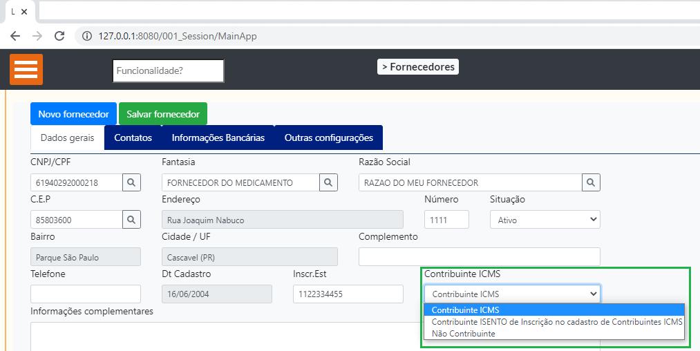 Outra etapa importante diz respeito a configuração do fornecedor que será devolvido os itens.