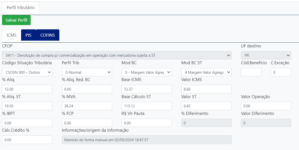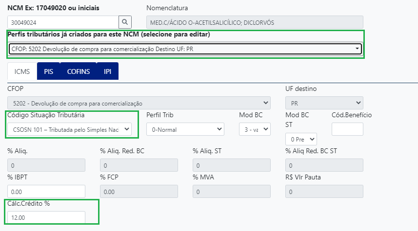 Agora se a NF-e de compra for tributada, SEM ST, o entendimento será configurar um perfil tributário para o NCM com CFOP 5202 e CSOSN 0101., conforme exemplo abaixo.