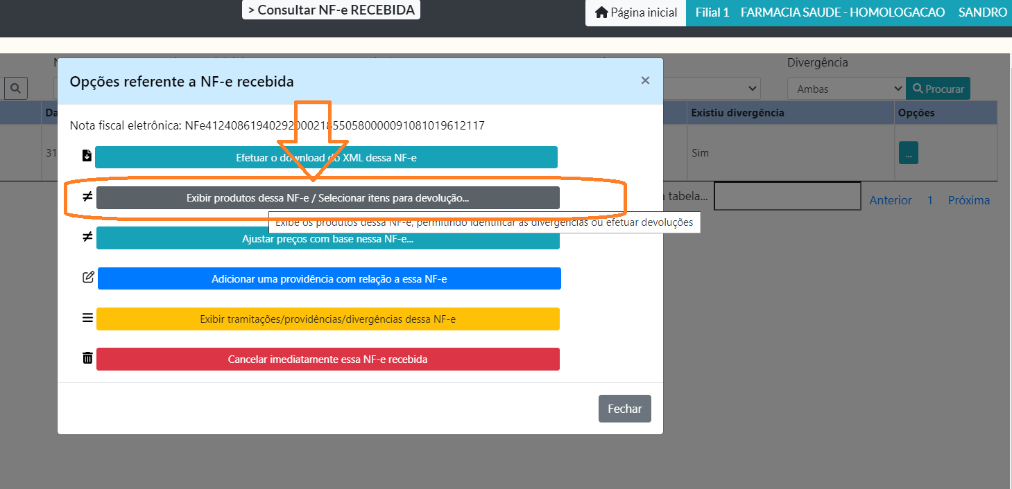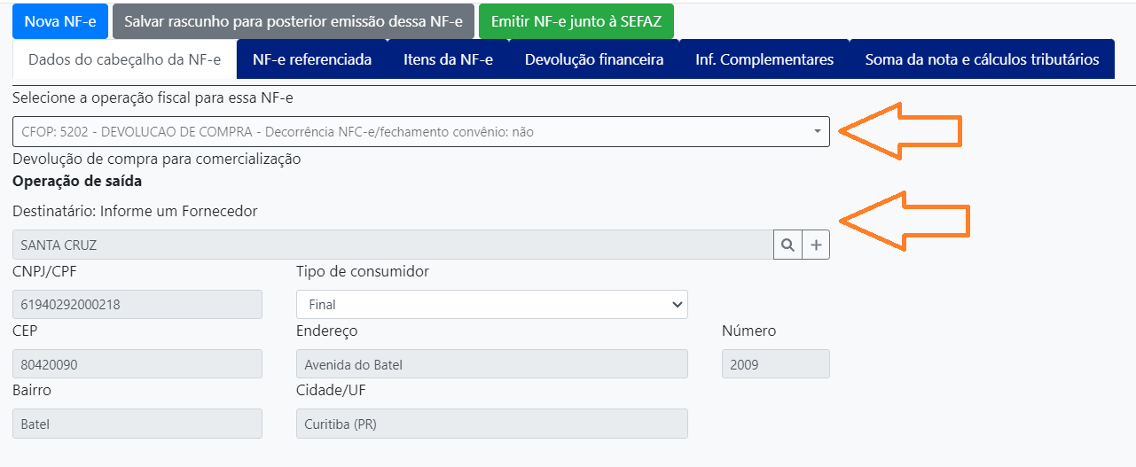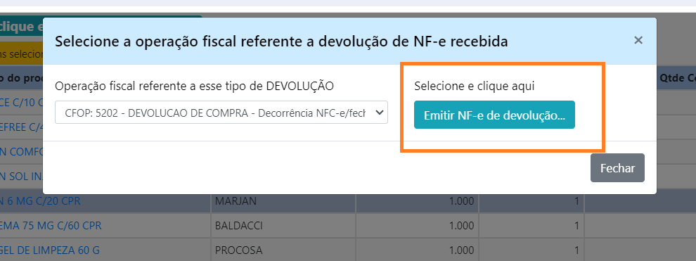 Após selecionar a operação fiscal, basta clicar em “Emitir NF-e devolução”.