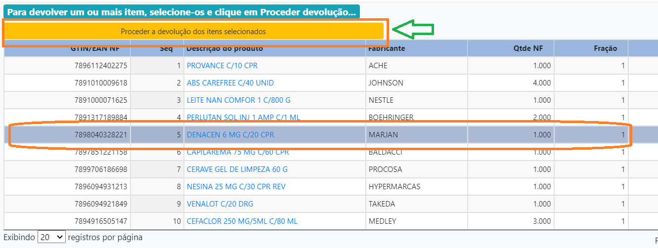 Agora na tela que se abre, selecione UM ou MAIS produtos a devolver e clique em “Proceder a devolução…“