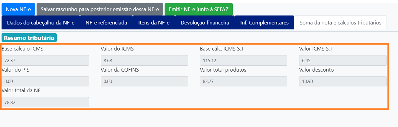 Ajustando os valores, caso deseje conferi como ficarão os valores após emitida, basta clicar em “Soma da Nota e cálculos tributários”.