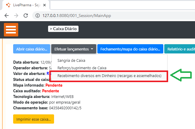 Acessar pelo WEB ou PDV o caixa diário.