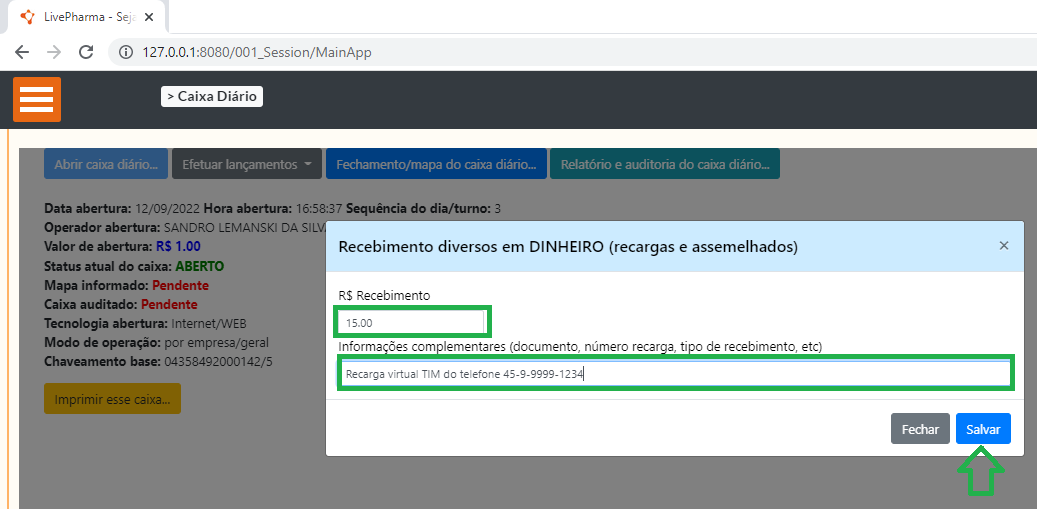 Feito o lançamento, ele será considerado DINHEIRO e, ao fechar o caixa diário, tal montante financeiro será adicionado ao Fluxo de caixa de sua empresa. Respeitando as configurações bancárias e plano de contas da forma de pagamento “01-DINHEIRO”.