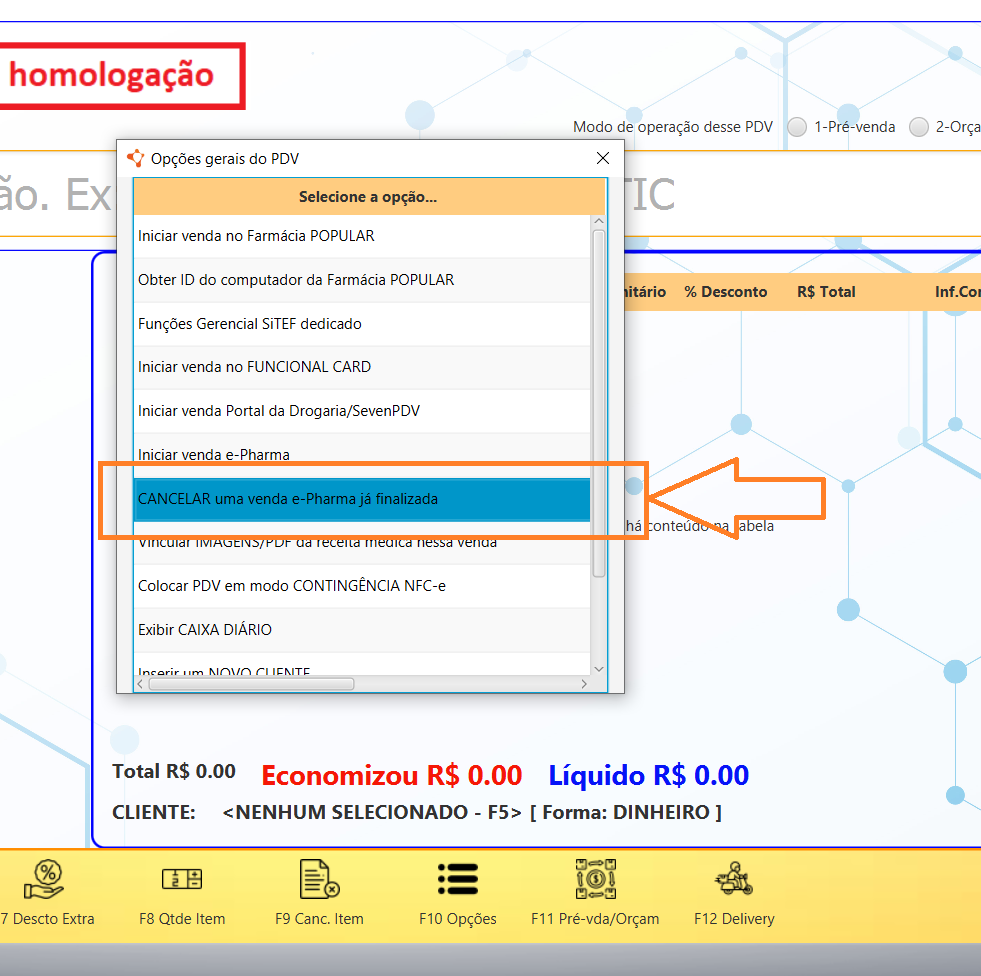 Feito isso, acesse o PDV, pressione F10 e selecione a opção conforme imagem abaixo.