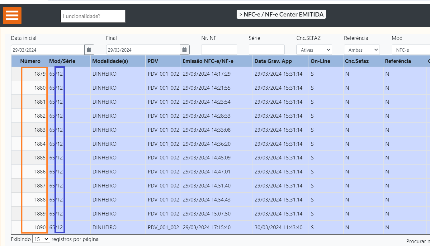 Se estiver com dificuldade em localizar tais informações no LivePharma, basta acessar a listagem das NFC-e emitidas conforme imagem abaixo e copiar as informações, conforme exemplo abaixo.