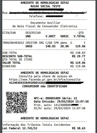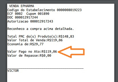 Conforme descrito, o e-Pharma envia o cupom vinculado que deve ser impresso da mesma forma que é enviado. Se tivesse um item, exemplo “ANADOR 500MG”, o valor do cupom seria X e do documento vinculado Y, podendo gerar alguma confusão no processo.