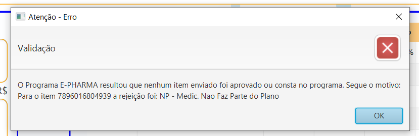 Basicamente funciona assim. Ao iniciar uma transação e-Pharma pode-se adicionar qualquer produto, ocorre que se algum item for rejeitado, será exibido uma mensagem assim.