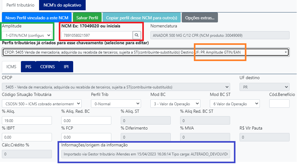 O destaque em VERMELHO, deve ser informado o NCM ou GTIN/EAN para buscar as configurações a ele vinculadas;