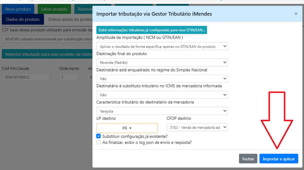 substituir_existente S ou N. Se Sim, ao importar alguma tributação, a configuração atual será substituida.