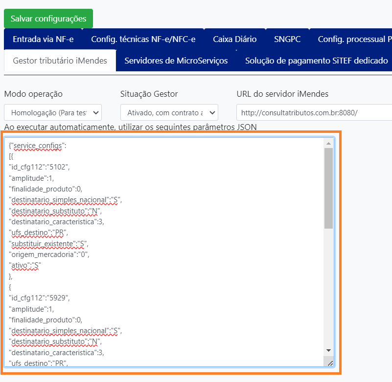 {“service_configs”: [{ “id_cfg112”:“5102”, “amplitude”:1, “finalidade_produto”:0, “destinatario_simples_nacional”:“S”, “destinatario_substituto”:“N”, “destinatario_caracteristica”:3, “ufs_destino”:“PR”, “substituir_existente”:“S”, “origem_mercadoria”:“0”, “ativo”:“S” }, { “id_cfg112”:“5929”, “amplitude”:1, “finalidade_produto”:0, “destinatario_simples_nacional”:“S”, “destinatario_substituto”:“N”, “destinatario_caracteristica”:3, “ufs_destino”:“PR”, “substituir_existente”:“S”, “origem_mercadoria”:“0”, “ativo”:“N” }, { “id_cfg112”:“5927”, “amplitude”:0, “finalidade_produto”:0, “destinatario_simples_nacional”:“S”, “destinatario_substituto”:“N”, “destinatario_caracteristica”:3, “ufs_destino”:“PR”, “substituir_existente”:“S”, “origem_mercadoria”:“0”, “ativo”:“S” }, { “id_cfg112”:“5949”, “amplitude”:0, “finalidade_produto”:0, “destinatario_simples_nacional”:“S”, “destinatario_substituto”:“N”, “destinatario_caracteristica”:3, “ufs_destino”:“PR”, “substituir_existente”:“S”, “origem_mercadoria”:“0”, “ativo”:“S” } ] } Texto em itálico