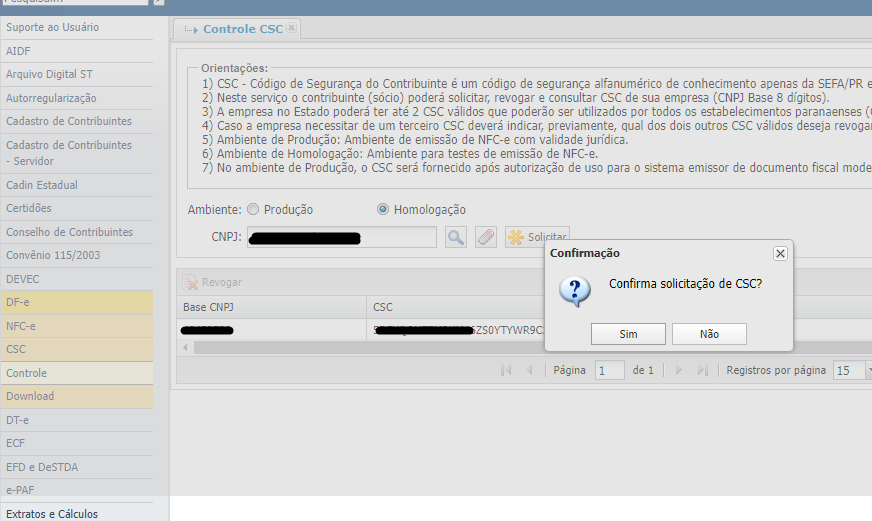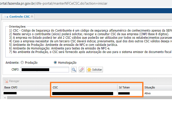 Agora informe seu CNPJ. Se for gerar um CSC para Produção, selecione tal opção. Se for gerar um CSC para Homologação, basta selecionar tal opção.