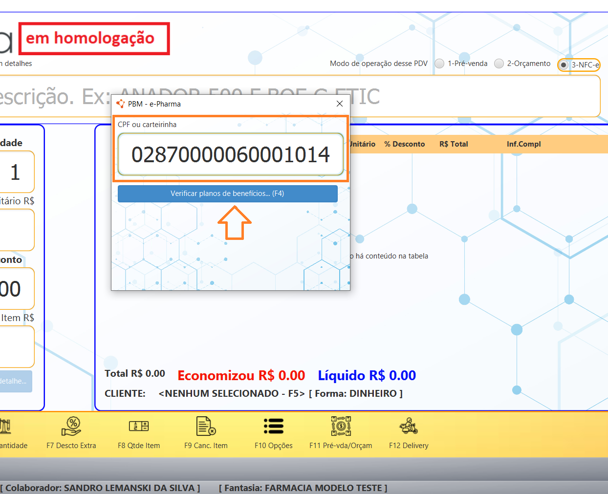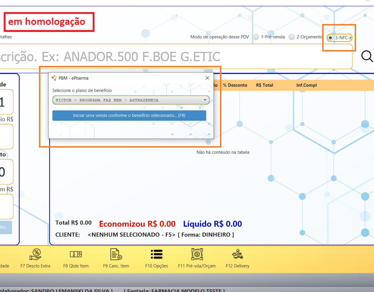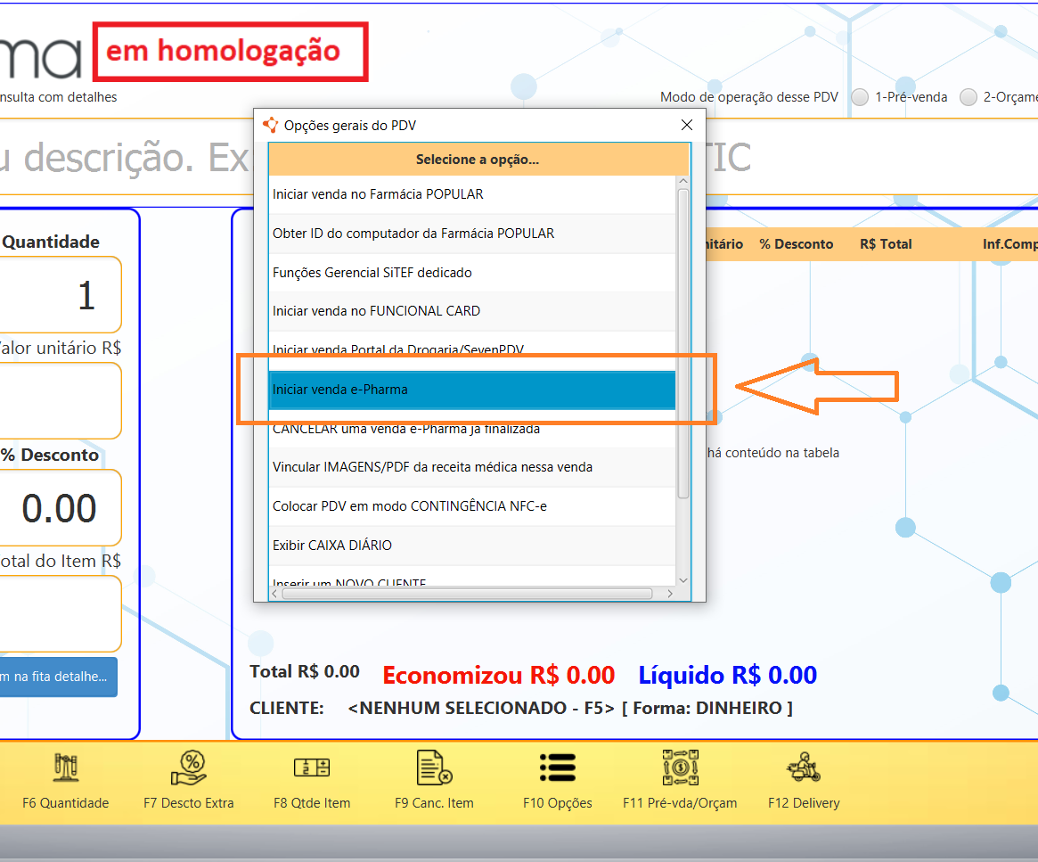 Para iniciar uma venda e-Pharma, selecione a emissão de NFC-e no canto superior direito e pressione F10